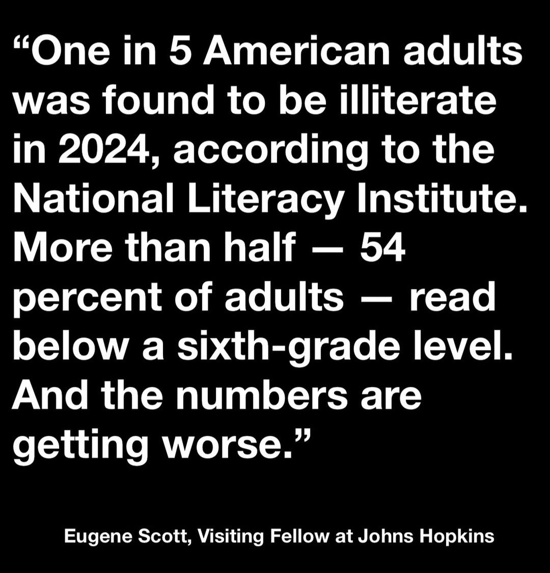 Leaving aside the need for an enlightened citizenry as necessary for a functioning democracy, what are the implications for the workforce? How can we imagine harnessing modern technology, new processes, and other innovations when many people can’t read at even a sixth-grade level?