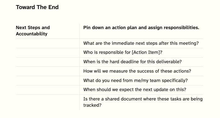 In practice, the three-phase model is just guidance. It may be appropriate to ask questions about goals at any phase, not just at the outset, but those questions may be more salient then. Likewise, the end of a meeting is not the only time to ask about responsibilities and next steps.