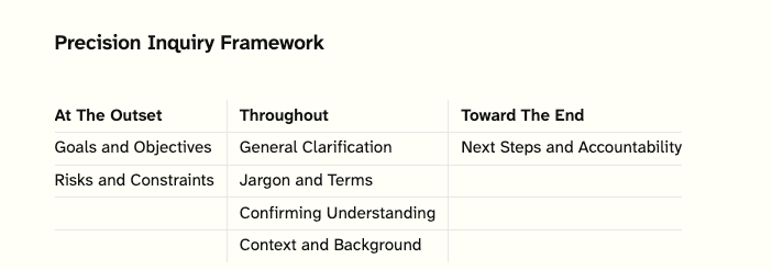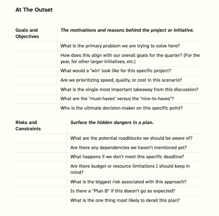Rather than ‘the exact 51 questions’, it might be better to use these seven categories of questions as a framework with 51 examples. Also, it might be ‘one less thing’ to drop the ‘archetypes of inquiry’ — like ‘The Architect’ or The Translator’ — and just use the parenthetical categories. Also, I have sequenced a conceptual meeting1 into three phases: At The Outset, Throughout, Toward The End.