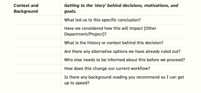 The cheatsheet drops out information that is quite helpful. Here’s his subtitle for the ‘Wide Lens’ category, parenthetically synonymed as ‘(General Clarification)’: ‘Pick one of these questions when the overall concept feels fuzzy and you need a high-level reset’.