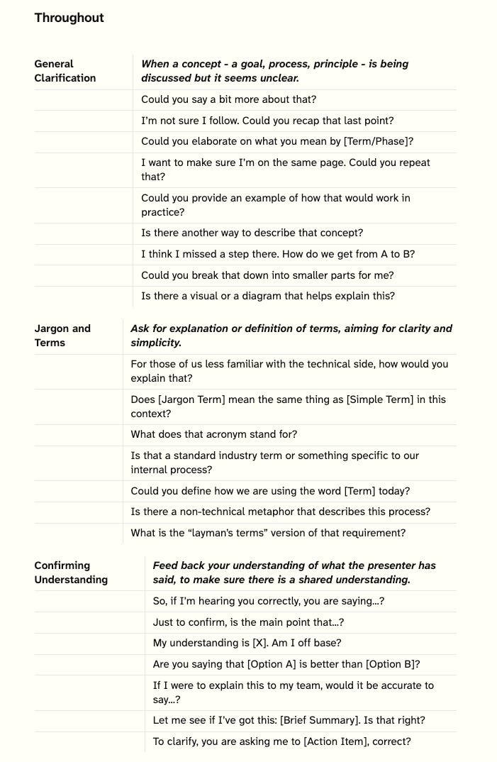 At the start, a presenter -- such as the person leading the project or initiative -- will likely lay out the purpose of the project, at which time questions about ‘goals and objectives’ are most salient. As the meeting progresses, other categories become relevant depending on the topic under discussion. When unclear jargon is used, ask questions to clarify the meaning of the jargon, for example, or if the presenter has not provided enough detail, or too much detail, feeding back your understanding could advance shared agreement on what is being said. As the meeting draws toward an end, next steps and accountability are called for before closing the meeting