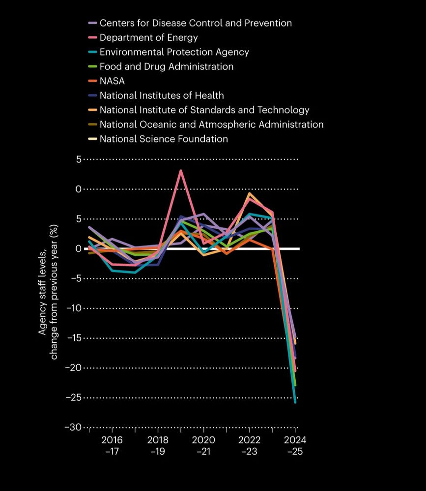 In total, federal science agencies lost about 20% of their staff in 2025 relative to the previous year, after modest increases over the past few years.