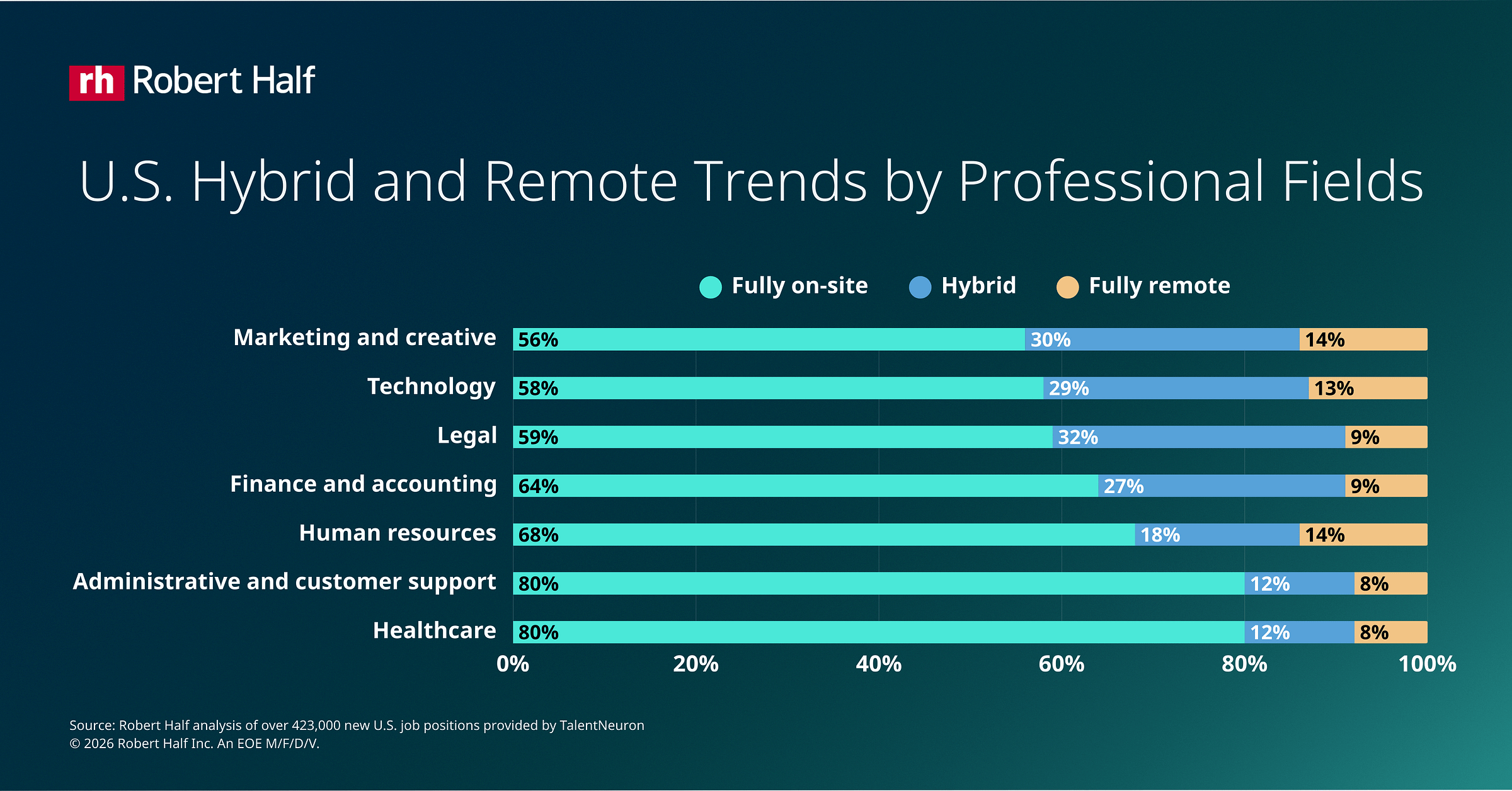 Robert Half’s Demand for Skilled Talent report shows that despite corporate calls for return to the office, hybrid still seems to be with us going forward into 2026, varying by field, seniority, and geography