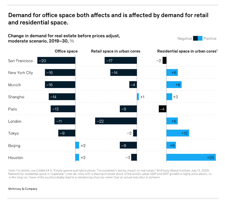 Fewer people downtown means lower demand for retail and residential space there, too. The downward spiral in US urban centers continues.