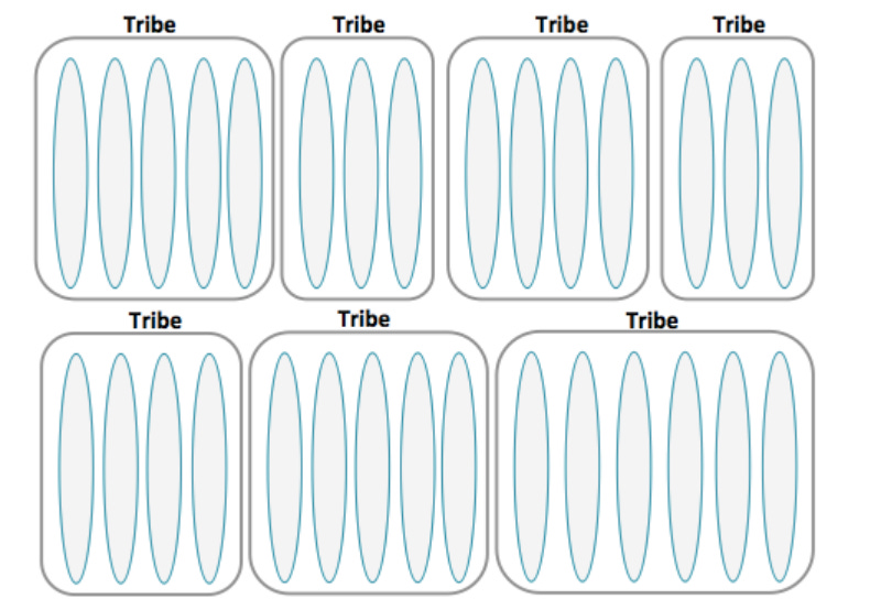 Tribe leads — who support the activities of perhaps ten or more squads, not by telling them what to do by enabling and coordinating across the groups, and creating a productive working environment. They often incubate squads.