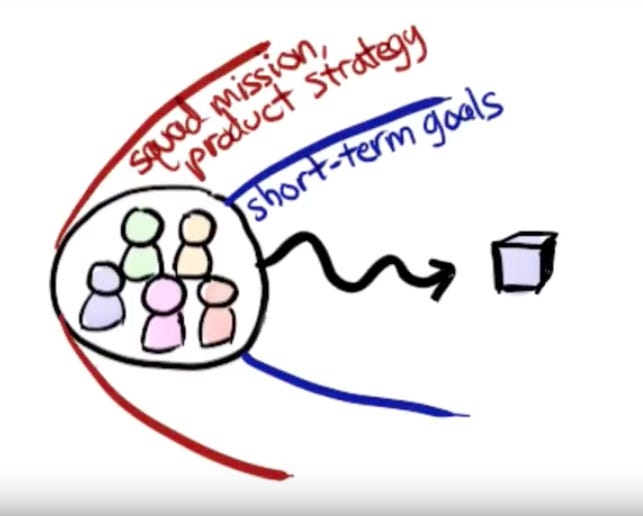 As shown above (taken from a video by Kniberg) the squad’s mission is detailed, informed by the overall product strategy, and each squad is operating against quarterly short-term goals. The arrow represents the path taken by the squad to deliver the feature.