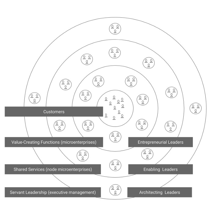I sidestepped their ‘lower levels’ of the organization — so difficult to escape the top-down mindset, even when researching innovative, non-hierarchical companies — by casting their model into the concentric circles representation I have been using to understand Haier’s Rendanheyi operating philosophy: