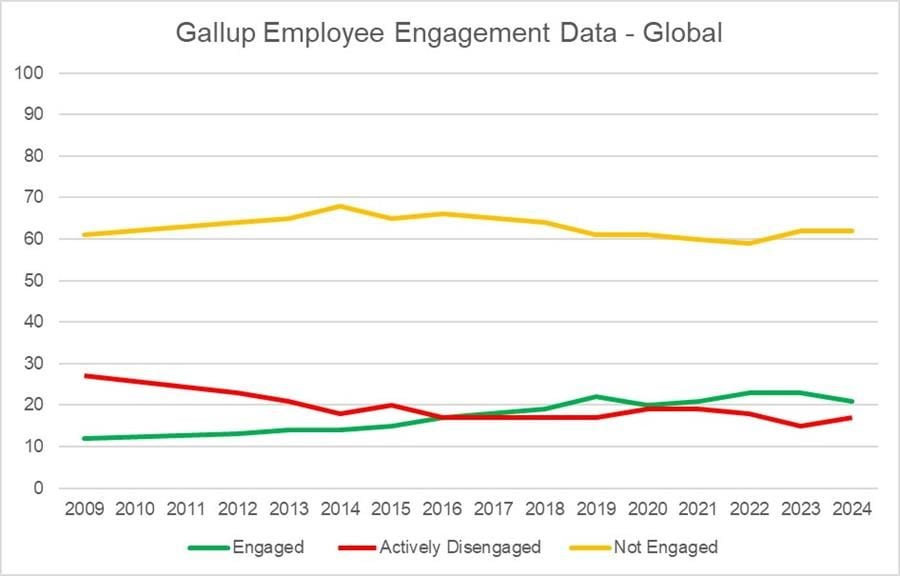 In that same period — 2012 to 2024 — the percentage of employees who are not engaged at work decreased by just two percentage points (or about three percent), from 64% to 62%.