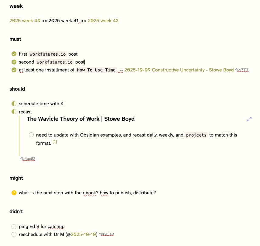 I’ll leave aside the nuts-and-bolts of how I manage this (in Obsidian), but the basic idea is clear: I start the week’s list on Monday, often pulling the unfinished from the previous week’s list. Some of the entries are convergent: like pinging my old friend Ed to set up a time to catch up (although I didn’t get to that during the week, so I moved it to didn’t). Both of the shoulds on this list are marked ‘in process’ (using the half-and-half icon). The single might is just a conjecture to perhaps investigate (I didn’t, but I will someday). The musts are where I focus the greatest attention, and, of course, if I fall short, I move the items to didn’t, although I work diligently to accomplish my musts.